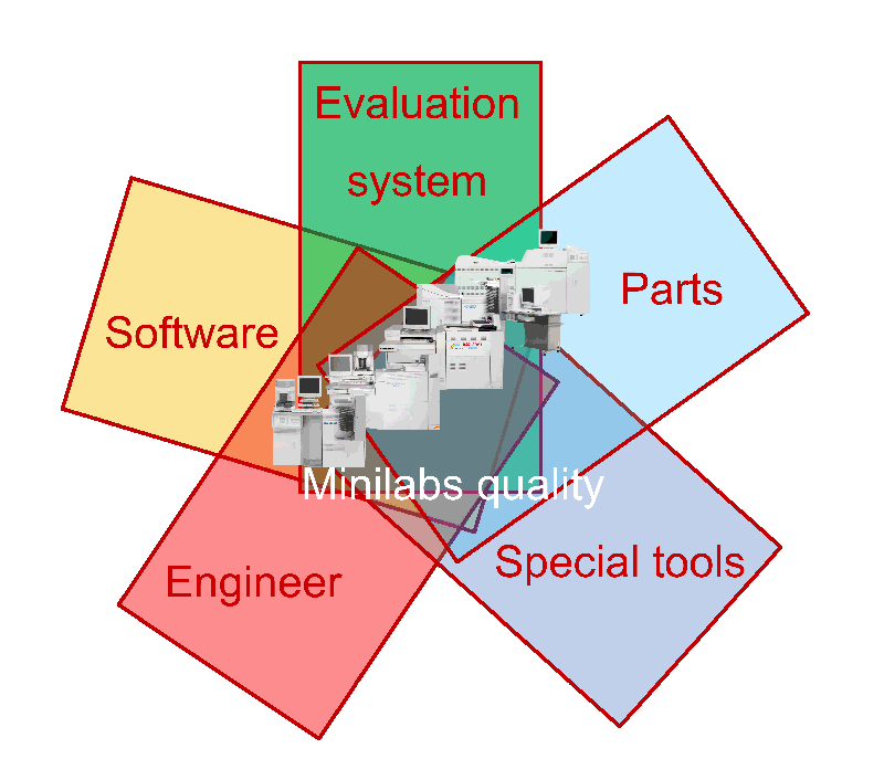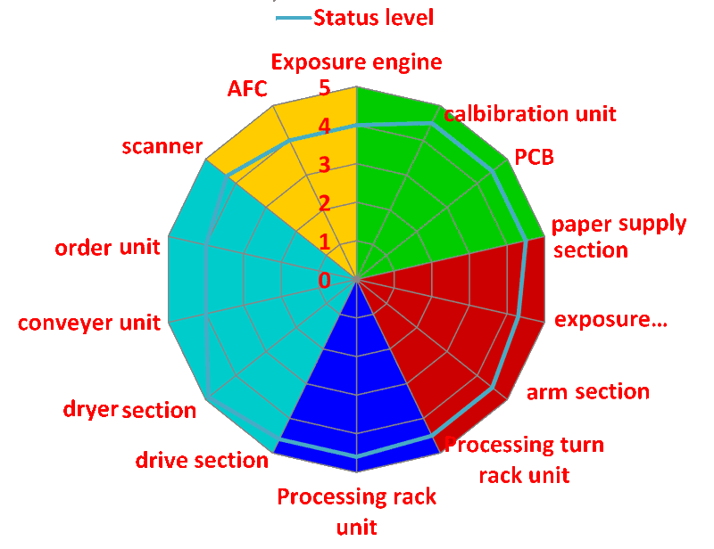 focusing on paper supply system, exposure and paper advance system, feeding paper arm system, color correction system, paper transmission system and replenish system, to ensure the parameters of the machines meet factory standards, hence improve the reliability of the photo finishing machines and the quality of the developed photos.